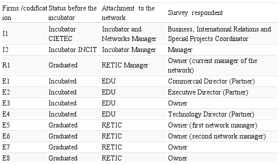 To select the interviewed companies, it was opted to approach four companies belonging to each network, which proved to be enough by the saturation criteria. The choice of such companies occurred because of the intensity of performance (leaders) in the network, since the process of formation of clusters. This way, it was obtained the total of 11 investigated actors, as pointed out in Table 2.