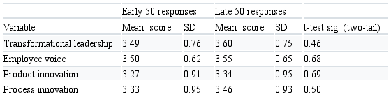 We also checked for non-response bias (Table 1) by comparing late responses with the early ones (Armstrong & Overton, 1977). The t-test of the 50 earliest and 50 latest responses, at a 95% confidence interval, did not reveal a significant difference. This implies that at p > 0.05, non-response bias is not a significant issue in this study (Rosca & Bendul, 2019).