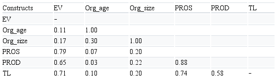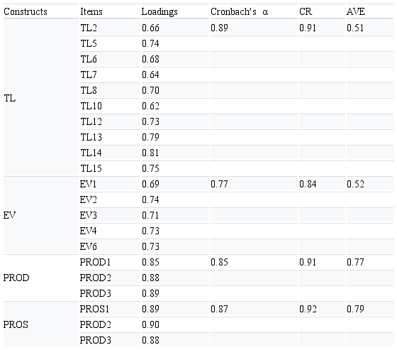 We conducted factor analysis by using the PLS algorithm in SmartPLS, which provides factor loadings and cross-loadings. The results in Figure 1 highlight that all the factor loadings were in an acceptable range, i.e. 0.61 to 0.90 (Hair, Hult, Ringle, and Sarstedt, 2014a; Hair, Black, Babin, and Anderson 2014b); after removing six items, i.e. TL1, TL3, TL4, TL9, TL11 and EV5. We deleted these items following the suggestions of Fornell and Larcker (1981) due to poor loadings or problematic significant cross-loading after considering the theoretical rationale. All the remaining items were loaded on their respective constructs with high loading scores which established a valid factor structure of measurement constructs.