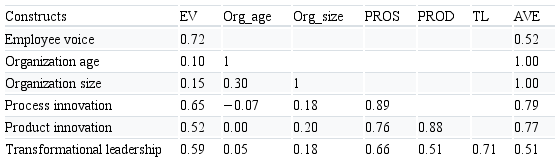 To confirm the convergent and discriminant validity of the measurement model, factor loadings, composite reliability (CR) and AVE criteria were used (Hair, Hult, Ringle, and Sarstedt, 2014a; Hair, Black, Babin, and Anderson 2014b). The values of CR ranging from 0.84 to 0.92 in Table 2 highlight that all variables showed good internal consistency (Hair, Risher, Sarstedt, & Ringle, 2019). The convergent validity is referred to as the extent to which the constructs converge to explain the variance of its items. The convergent validity was assessed through the average variance extracted (AVE) for all items on each construct. The values of AVE (TL =0.51; voice = 0.52; product innovation = 0.77; process innovation = 0.79) in Table 2 shows that all constructs explained at least 50% of the variance of its items which fulfills the minimum benchmark (Fornell & Larcker, 1981; Hair, Risher, Sarstedt, & Ringle, 2019).