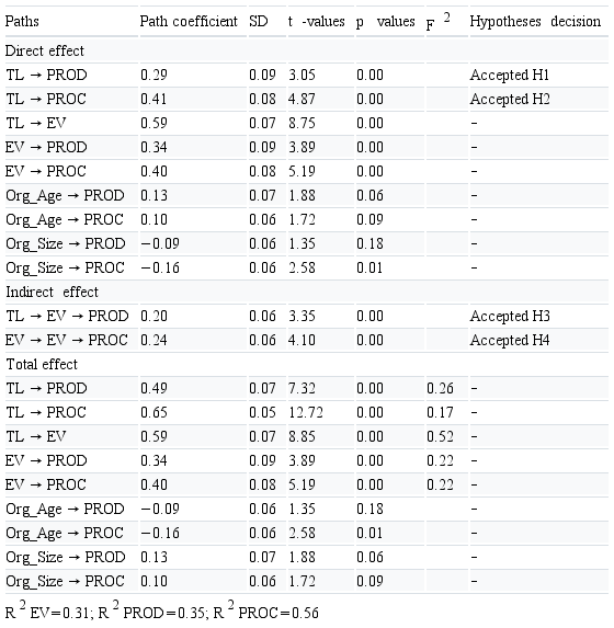 The structure model in SmartPLS provides an inner-modeling analysis of the direct and indirect association between independent, mediators and dependent variables, including t-values and path coefficients. The path coefficient is like the standardized beta coefficient in regression analysis (Henseler, Ringle, & Sinkovics, 2009). For the said purpose, we followed the suggestions of Hair, Hult, Ringle, and Sarstedt (2014a), Hair, Black, Babin, and Anderson (2014b) and performed a bootstrapping method with 10,000 resampling iterations to determine the beta and t-values. T-value higher than 1.96 and p-value less than 0.05 indicate a significant relationship at a 95% confidence interval (Hair, Hult, Ringle, and Sarstedt, 2014a; Hair, Black, Babin, and Anderson, 2014b). Table 5 illustrates the results of the structural model shown in Figure 2. The results show that TL has a positive and statistically significant impact on product (β = 0.29; t = 3.05; p < 0.00) and process (β = 0.41; t = 4.87; p < 0.00) innovation. Organization size (control variable) relates negatively to process innovation (β = −0.16; t = 2.58; p < 0.01) in the model. The findings further suggest that employee voice significantly mediates the relationship between TL and product (TL [1] → EV [2] → PROD [3]) (β = 0.20; t = 3.35; p < 0.00) and process innovation (TL → EV → PROC [4]) (β = 0.24; t = 4.10; p < 0.00), therefore, H3 and H4 are accepted. Moreover, the results suggest that the organization age (control variable) has a negative influence on the total (both direct and indirect effect) impact of transformation leadership and employee voice on process innovation (β = −0.16; t = 2.58; p < 0.01).