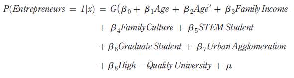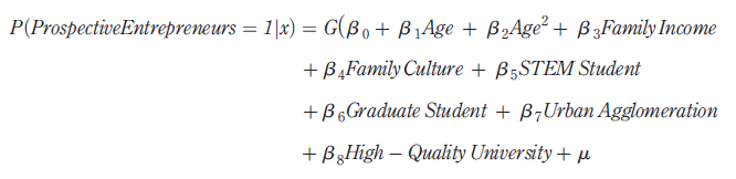 [Model V]where the probability, P, of each entrepreneurial phenomenon is a function of a set of predictors, G, ranging between 0 and 1 (Wooldridge, 2000). To each variable a parameter b. is assigned and l is an error term. In Models III, IV and V, “University Support” is in between parentheses because of its exclusion for robustness checks as mentioned above. Next, we analyze the empirical outcomes of the models’ estimations.