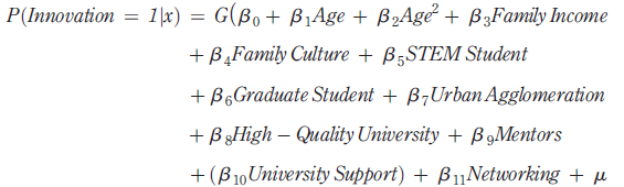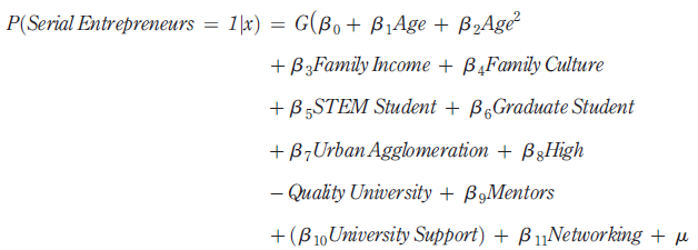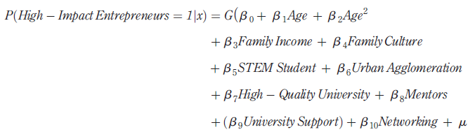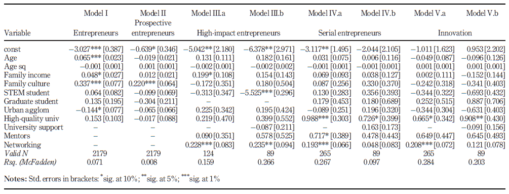 As the variable “University Support” generates a considerable amount of missing values, estimations for entrepreneurial cohorts (“High-Impact Entrepreneurs,” “Serial Entrepreneurs” and “Innovation”) are applied both with and without this variable for robustness checks. As there are no observations for “Graduate Student” within the group of “High-Impact Entrepreneurs,” this predictor was excluded from estimations for this dependent variable. We also included a squared term for “Age,” aiming at identifying potential curvilinear patterns for this indicator. Applications of the general model described in equation (1) can be stated as follows: