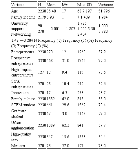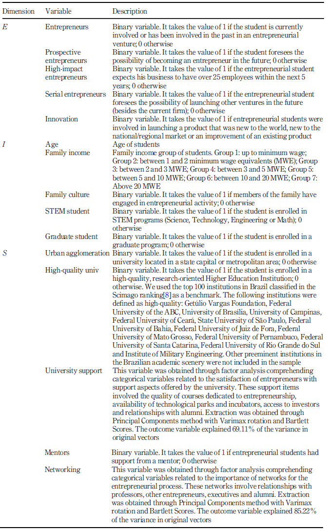 This set of variables allows assessing five different indicators related to entrepreneurial activity. Besides entrepreneurship per se, we can identify the determinants behind prospective entrepreneurs, high-impact new ventures, serial entrepreneurs and innovation-driven entrepreneurship. While the variables related to entrepreneurship, high-impact entrepreneurs, serial entrepreneurs and innovation refer to actual entrepreneurial behavior, the prospective entrepreneurs variable measures entrepreneurial intent (Shapero, 1984). Entrepreneurial intent can be defined as “state of mind that directs the attention and actions of an individual toward situations of self- employment” (Fayolle and Gailly, 2015, p. 76). However, although the concept is widely used as a proxy for entrepreneurial behavior (Fayolle and Gailly, 2015; Liñán and Chen, 2009; Liñán et al., 2011; Moraes et al., 2018), it is only the precursor of a complex process of entrepreneurial behavior (Kolvereid, 1996; Lee and Wong, 2004). In this sense, addressing these aspects is desirable as it offers the possibility of drawing a complete picture of the underlying dynamics of student entrepreneurship. In its turn, predictors follow a long tradition of variables of interest addressed by dedicated research (Di Gregorio and Shane, 2003; Fini et al., 2011; Glaeser, 2007; Radosevic and Yoruk, 2013; Stam, 2009).