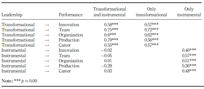 In summary, this study confirms the importance of transformational leadership as found in previous analyses (Zach & Baldegger, 2017) and also adds to literature by including the analysis of instrumental leadership, in accordance with Antonakis and House (2014) and Bormann and Rowold (2018), in the context of Brazilian startups.