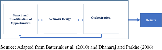 We consider the theoretical model of orchestration in three complementary phases Search and Identification of Opportunities, Network Design and Orchestration Process, according to Figure 2. The initial phase (Search and Identification of Opportunities) is fundamental to portraying a broad understanding of the orchestration of innovation networks. Also, the literature has not sufficiently developed this phase. Thus, the proposition of Batterink et al. (2010) adds the prior phase to the steps of Network Design and Network Orchestration (Dhanaraj & Parkhe, 2006).