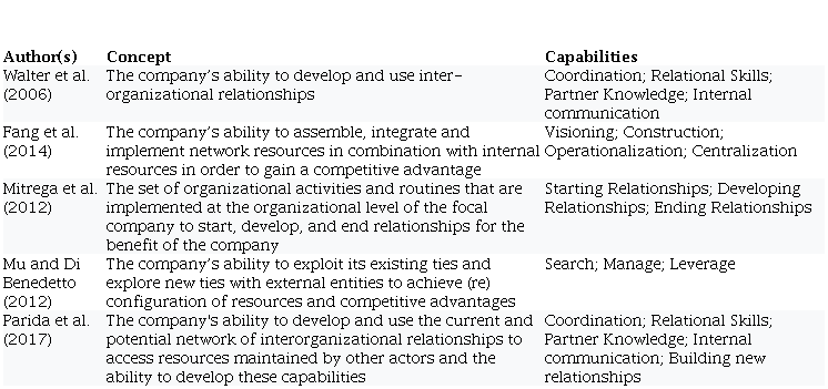 Specific capabilities to create, maintain and explore interorganizational relationships are broadly discussed in the literature (Ayväri & Möller, 2008). At the organizational level, these capabilities reflect both networking architecture – Networking Ability (Hakansson, 1987), Network Competence (Ritter, Wilkinson, & Johnston, 2002) – and relationship dealing – Relationship Management Capacity (Havila & Medlin, 2012). Nonetheless, individual skills capable of maintaining and animating the interaction between organizations for distinct purposes exist in the literature, such as Cooperative Competency (Sivadas & Dwyer, 2000), Alliance Capability (Kale, Dyer, & Singh, 2002; Swaminathan and Moorman, 2009; Frels, Shervani, & Srivastava, 2003) and Relational Capability (Capaldo, 2007).