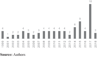 Regarding the evolution of publications (Figure 3), until 2016, there is an oscillation in the number of publications on the theme, without a definite trend. However, in 2017, we found a significant increase, highlighting the pertinence of the topic. There were no temporal constraints in the systematic search; however, the first relevant publications were published in 1999, namely, Capello (1999), Lawson and Lorenz (1999), Maskell and Malmberg (1999) and Nooteboom (1999). Maskell and Malmberg (1999) is the most cited article (981 citations) according to WOS.