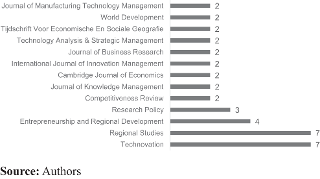 Figure 4 presents journals that had at least two occurrences in the sample. The two most recurring journals, Regional Studies and Technovation, have an impact factor of 3.312 and 5.720, (2019), respectively, which highlights the high quality of the journals.
