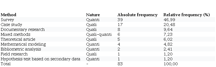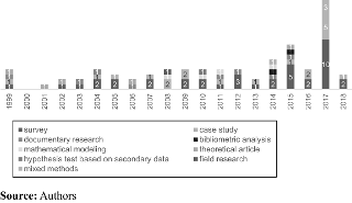 Regarding the scientific methods (Table 2 and Figure 5), we observed a predominance of the survey, followed by case study. Survey has kept stable between 1999 and 2014, and after that, we observed an increase in 2017. Documentary research, the third most common method in the sample, presented a stable frequency over the years. There are 31 qualitative articles, 46 quantitative articles and 6 qualitative-quantitative articles; thus, the quantitative approach was predominant. Of the four papers that use mathematical modeling, three adopted multicriteria decision models: Ucler (2017) (Fuzzy e Analytic Hierarchy Process – AHP), Boly, Morel, Assielou, and Camargo (2014) (Fuzzy), and Rejeb, Ben, Morel-Guimarães, Boly, and Assiélou (2008) (AHP and ELECTRE).