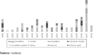 Concerning interorganizational networks, the most recurrent is the cluster, followed by network, industrial district and innovation system (Figure 6). The term “network” is a generic term that can encompass all types of agglomerations, including industrial clusters.