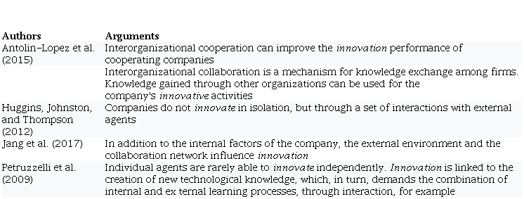 Ter Wal and Boschma (2011) argue that, to be innovative, location matters. On the one hand, literature points out that organizations tend to have better performance and opportunities when they are embedded in collaboration (Moreno & Miguelez, 2012; Whittington, Owen-Smith, & Powell, 2009). On the other hand, organizational competitiveness is based on the development of commercial networks (Pechlaner & Bachinger, 2010), especially in the context of clusters where the proximity between small and medium-sized companies facilitates the flow of resources, information and knowledge sharing (Ucler, 2017). In essence, industrial clusters can be considered an alternative interorganizational network as they are environments driven by competition and cooperation (Strand, Wiig, Torheim, Solli-Sæther, & Nesset, 2017).