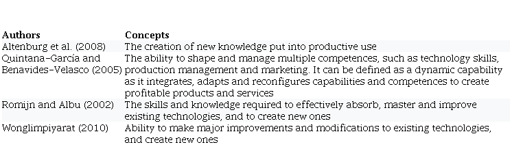 Thus, the actors in a cluster end up operating more productively, increasing access to technology and information exchange while enabling the development of innovation capabilities (IC) (Cespedes-Lorente, Antolin-Lopez, Martinez-del-Rio, & Perez-Valls, 2015; Porter, 2003; Romijn & Albu, 2002; Strand et al., 2017; Wonglimpiyarat, 2006). The term IC comes from literature on dynamic capabilities (DC) (Teece, 2017), which are the ability to renew competencies to meet the demands of the business environment, as innovative responses are needed when the pace of technological change is rapid, and the nature of competing firms and the market is difficult to identify (Teece, Pisano, & Shuen, 1997). Helfat and Peteraf (2003) also claim that capabilities can evolve and change over time. Meanwhile, Ter Wal and Boschma (2011) relate DCs to the introduction of innovations in the marketplace as change processes encapsulated in a company's routines. Thus, IC can be considered a DC. IC can be understood as the instrument needed to achieve success (Martínez-Román, Gamero, & Tamayo, 2011) by responding to the external environment in a proper manner (Akman & Yilmaz, 2008), or by putting new knowledge into productive use (Altenburg, Schmitz, & Stamm, 2008). Therefore, IC can be understood as multiple skills and competencies needed to absorb, dominate and enhance or create new existing products, services or processes to meet market needs and generate profit (Quintana-García & Benavides-Velasco, 2005; Romijn & Albaladejo, 2002; Szeto, 2000).
