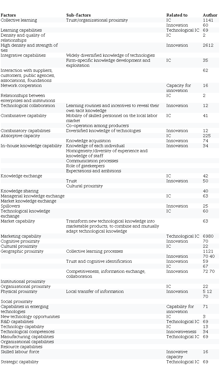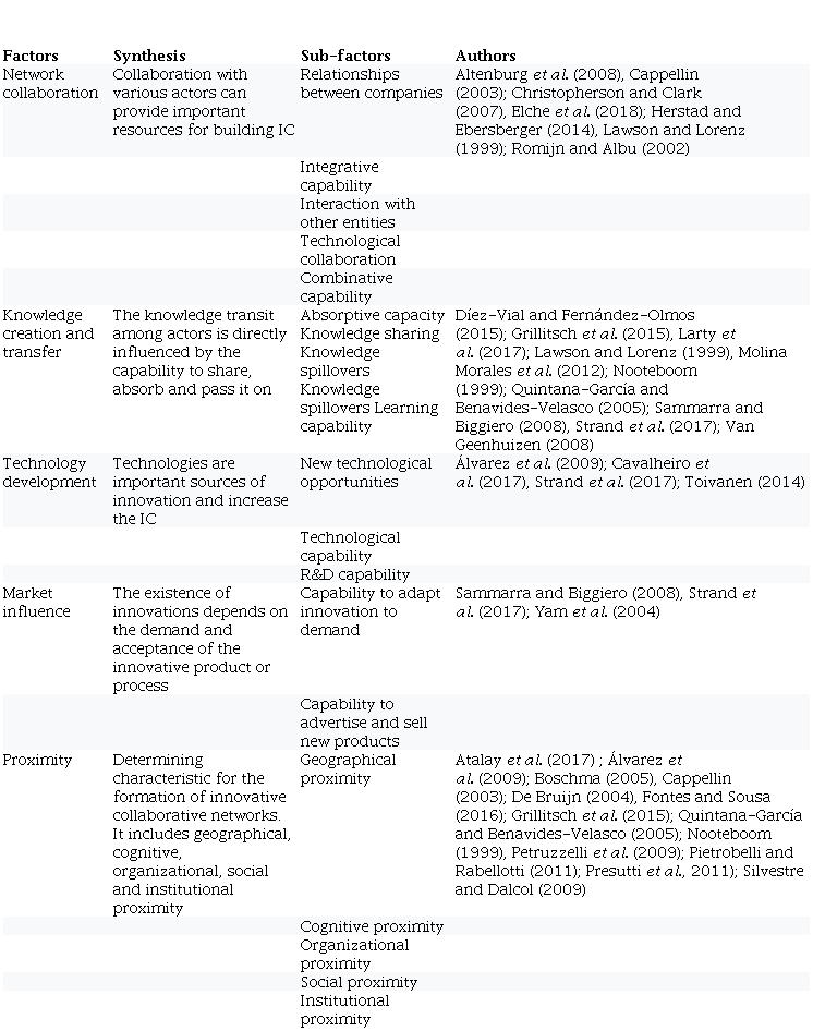 Although literature on IC has been spread in the context of collaborative networks (Appio, Martini, Massa, & Testa, 2017), there are limitations in current research regarding industrial clusters. Some authors have focused on interorganizational network and the innovation process, as Dagnino, Levanti, Minà, and Picone (2015). Salim, Ab Rahman, and Abd Wahab (2019) dedicated their studies to internal capabilities and eco-innovation performance of manufacturing firms. Dagnino et al. (2015) mapped the main themes of literature on interorganizational network and innovation, without encompassing the factors that lead companies to the development of IC. Thus, literature on IC in the specific context of clusters remains scarce, especially when focusing on factors and subfactors that enable cluster-based companies to be innovative.