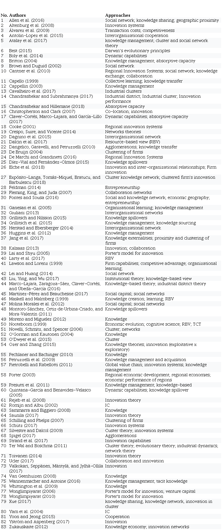 Literature also indicates that the collaborative environment in clusters increases the access to technology, boosting IC (Antolin-Lopez et al., 2015; Porter, 2003; Strand et al., 2017; Wonglimpiyarat, 2006). Thus, we found possible to identify several factors that lead or influence IC in clusters (see Table 6; the numbers represent the authors listed in the Appendix). This table also presents the innovation term used in each article. The terms with the greatest corroboration in literature are geographical proximity, absorptive capacity and knowledge exchange, with five, three and three occurrences, respectively. This does not mean that within the entire sample, these and other terms were not used in different articles. This concerns the factors considered necessary for IC, in the context of these papers. Further explanation is presented in Section 5.