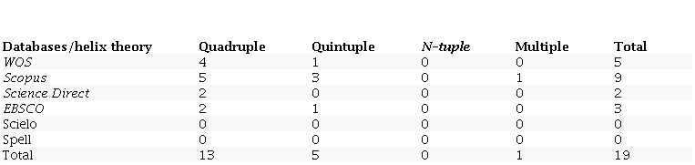 2. Step 2 – literature search: An integrative review should cover relevant studies to support the search for answers to the central research question. To this end, academics define and develop research focuses that bring precision to the study, avoiding biases and inaccurate outputs. For this study, we searched articles in international and national bases, such as the main collection of the databases Web of Science (WOS), Scopus, Academic Search Premier – ASP (EBSCO), Science Direct, Scielo and Spell. We used the following terms for selecting the studies: “Quintuple_Helix” or “Quadruple_Helix” or “N-Tuple Helix” or “Multiple_Helix” and “Science_Park” or “Technology_Park” or “Research_Park” or “Science_and_Technology_Park” or “Science Technology Park” or “Incubator,” in the topic field; that is, we searched these words in the articles’ title, abstract and keywords. We used these English terms in international databases, and for the national bases, we translated the terms into Portuguese. Furthermore, in the Scopus, WOS and EBSCO databases, we used the trick characters (*) to expand the search for similar terms. We considered the publication period until 2018 in Portuguese and English. Table 1 summarizes the studies found in each base. Altogether, we identified 19 studies.