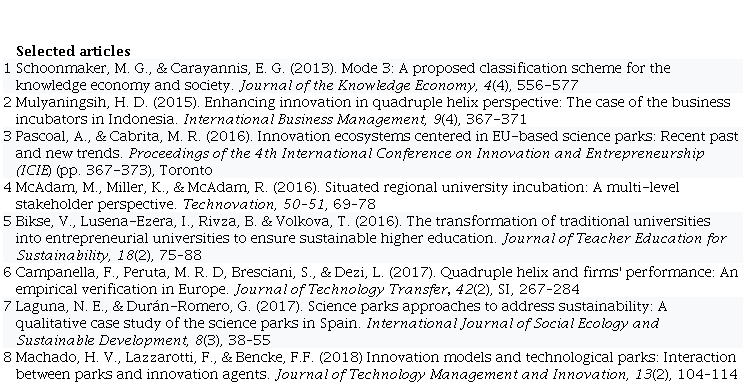 Regarding the helix performance, some studies clearly highlight its operation, whereas others address its relevance. Schoonmaker and Carayannis (2013), McAdam et al. (2016) and Pascoal and Cabrita (2016) do not explain the performance of each helix but report situations where they were important. Schoonmaker and Carayannis (2013) address the community culture as the environment where the three actors (academia, government and industry) operate together to create innovation, that is, it regards TH. McAdam et al. (2016) strengthen that universities recognize the importance of collaborative relationships with industry and end users for increasing incubation’s success. STPs are seen as actors capable of articulating several partners and fostering regional development in the quadruple helix (Pascoal & Cabrita, 2016).
