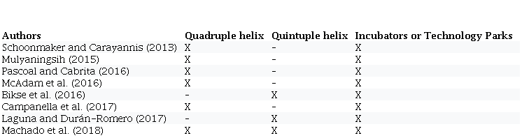 As for the theoretical approach, there are more studies related to the quadruple helix and STPs. The proposal by Carayannis and Campbell (2009) and Arnkil et al. (2010) on the quadruple helix prevails, as an organized civil society and innovation user, respectively. However, there is evidence of a formal and a virtual society. In the quintuple helix, Laguna and Durán-Romero (2017) add two approaches, one focused on green companies and the other on the need to preserve the environment. Furthermore, in these studies, theories relate to innovation, public policies, innovation ecosystems, networks and the entrepreneurial university.