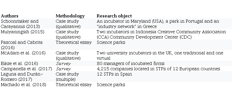 The IASP is the main reference for incubators and STPs. Pascoal and Cabrita (2016) strengthen the intermediation role played by STPs among academia, government organizations and private companies, formally or informally. Hence, they consider them as instruments for the promotion of regional development and reindustrialization.