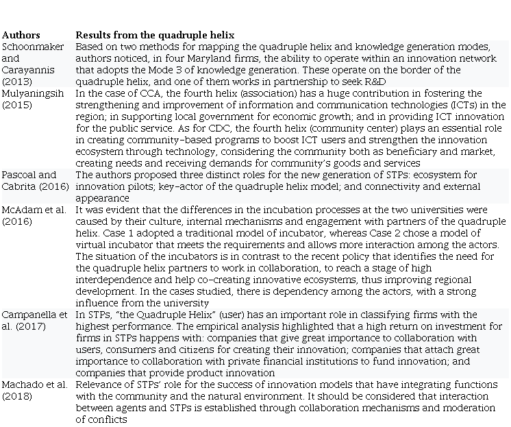 Through these approaches, we examined the actors that represented the QQHs, their performance and the main results associated to the helices. Actors related to the quadruple helix took different forms: community culture (Schoonmaker & Carayannis, 2013); community represented by an association and a community center (Mulyaningsih, 2015); user (McAdam et al., 2016); no specific actor (Pascoal & Cabrita, 2016); citizen (Campanella et al., 2017); and finally, society acting in co-innovation (Machado et al., 2018). This last study mentions three types of society: