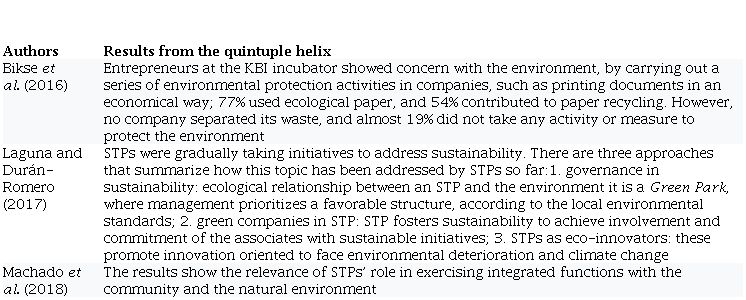 Yet, regarding the quintuple helix, there was a similarity among the studies in not identifying a representative, but instead the actions that foster sustainable development. Among the results, there were sustainable actions done by entrepreneurs and those developed by STPs managers.