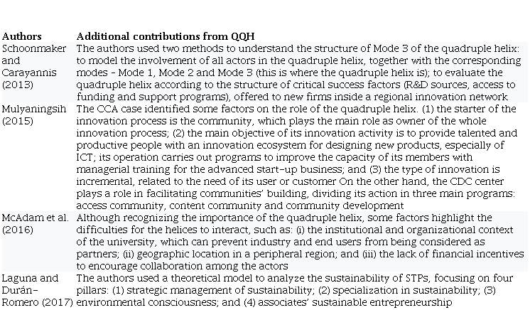 Based on changes in the economic and social scenarios, new theoretical approaches emerge to explain the innovation process, such as the QQH. Incubators and STPs are favorable settings for interactions, according to the new models; however, there is a lack of studies addressing this topic in such environments. Hence, this study contributes to understanding the existence and performance of QQH, by showing how these new helices were identified, in addition to advancing the subject in innovation environments such as incubators and STPs.
