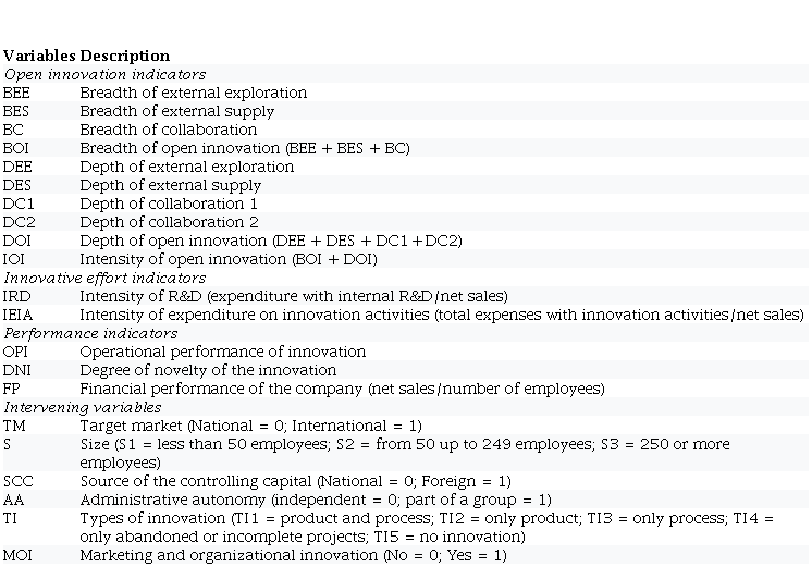 After validation, the indicators related to the constructs proposed herein were calculated for each company in the database, namely, intensity of open innovation (breadth, depth and total); intensity of innovative effort (investments in R&D and innovation activities); innovative performance (degree of novelty and OPI); and financial performance of companies.