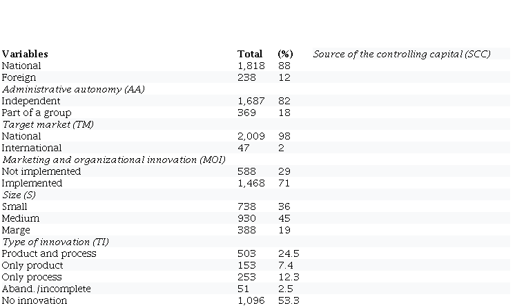 Variables used is as follows: SCC – source of the controlling capital (national or foreign); AA – administrative autonomy (independent or part of a group); TM – target market (national or international); S – size (from 10 up 49 employees [S1], from 50 up to 249 employees [S2]; more than 250 employees [S3]); and MOI – marketing and organizational innovation (implemented or not). Table 1 presents the list of the constructs used in our research.