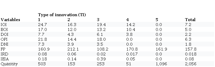 The database was identified by the following five different groups: TI1 – companies innovating in product and process; TI2 – companies that innovate only in product; TI3 – companies that innovate only in process; TI4 – companies that abandoned or did not finish innovation projects; TI5 – companies that did not accomplish any innovation activity.