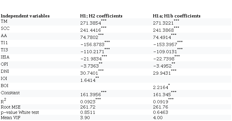 (H1; H2; H3)FP = α + β0IOI + δ1SCC+ δ2AA + δ3TM + δ4IRD + δ5MOI + δ6IEIA + δ7S1+ δ8S2 + δ9TI1 + δ10TI2 + δ11TI3 + δ12TI4+ λ1OPI + λ2DNI + ε