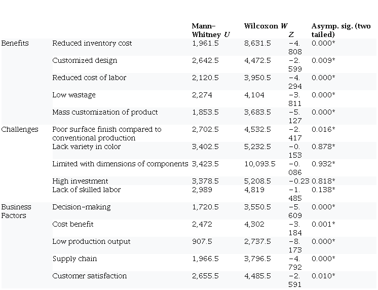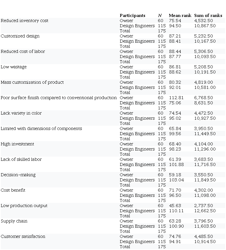 Investment cost in additive manufacturing and benefit of recovery of cost has shown negative regression results with (p = 0.006 < 0.005); the Mann–Whitney U test shows positive results, as design engineers feel that cost benefit can be achieved through the introduction of new products as this technology provides an opportunity to produce customized products, which can cater to new market and new customers. Therefore, the return on investment would be possible through additive manufacturing.