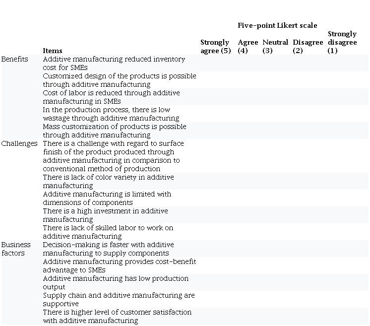 The study has undertaken 175 small- and medium-sized industries at Belagavi, Karnataka. A total number of 425 small- and medium-sized industries operate in Belagavi, Karnataka, specializing in foundry products and machining for automobile industry in India and abroad. The responses from the respondents were collected through e-mail survey. The participants in the study include SME owners and design engineers of the organizations. The two types of participants bring in the much needed variability and different perspectives; engineers’ view is more on a functional level and owners view it from an economic and feasibility angle. Our study relies on 15 variables and structural equation modeling (SEM) was conducted to understand the challenges faced by small- and medium-sized industries in adopting additive manufacturing.