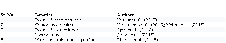 Hence, the study considers the following benefit factors associated with additive manufacturing.