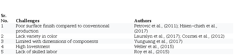 The additive manufacturing technology offers faster production rates compared to conventional investment casting and with better accuracy (Olkhovik, Butsanets, & Ageeva, 2016). However, challenges faced are first, notion of industries that additive manufacturing is useful for research purpose in laboratories rather than fabrication work on the industrial shop floor (Inigo et al., 2016). Second, surface finish and strength of the products obtained from additive manufacturing is poor as compared to conventional manufacturing processes (Hsien-Chieh et al., 2017). Third, all materials and colors cannot be printed (Lauralyn et al., 2017). Fourth, limitation with respect to dimensions of the component (Yunguang et al., 2017), and finally, investment is high (Weller, Kleer, & Piller, 2015). Therefore, this study considers the abovementioned factors associated with challenges of additive manufacturing implementation in the organization.