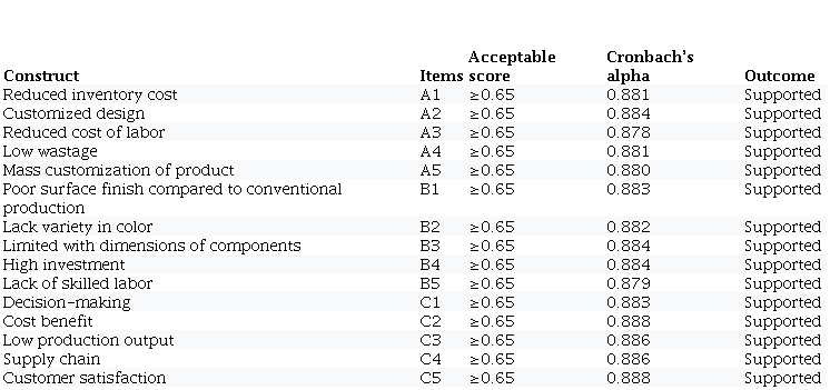 A three-stage data analysis was conducted; in the first stage, content validity was conducted to eliminate the subjectivity of the measurement. Content validity was conducted through the inclusion of four experts from academia and four experts from industry. Their selection was based on the number of years of experience in the field of 3DP and additive manufacturing. Academicians were involved in the area of technology management, manufacturing technology and additive manufacturing. The academicians had an experience of more than 10 years in the area of technology management and manufacturing technology, whereas two experts in the area of additive manufacturing had eight years of experience in the field of 3DP and additive manufacturing. All the four academicians were teaching in an engineering college of national repute. Although the experts from the industry include senior managers in the small- and medium-sized enterprise with more than 15 years of experience in the field of computer aided design, Cronbach’s alpha (CA) and 3DP. One senior manager working at a reputed SME has designed and developed indigenous 3D printers and provided a few solutions to SMEs.