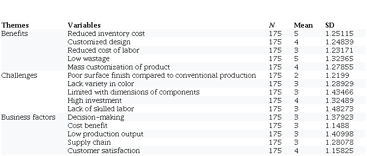 In summary, the results indicate that factors from all three perspectives (benefits, challenges and business factors) have significant influence on the adoption of the additive manufacturing in small-and medium-sized industries. Relative advantage of reduction of inventory cost and reduction of wastage in production positively affect the adoption of additive manufacturing. Challenges with regard to high investment, skilled labor and acceptance of limited dimensions (size) of components have a negative effect on additive manufacturing. Business factors regarding supply chain management, production output and cost-benefit analysis need deeper understanding, as these firms perceived challenges associated with these factors in the business environment.