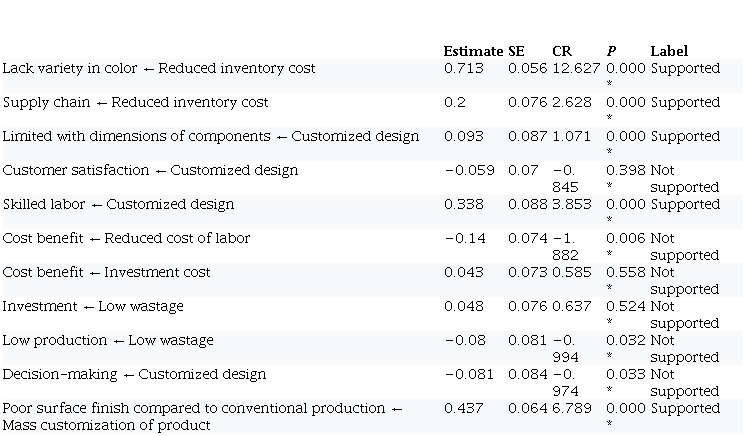 Regression results through SEM shows (p = 0.32 < 0.005) lower production output through additive manufacturing, but the design engineers have differed with regard to lower production output, as additive manufacturing has the capacity to include large number of design components and can customize according to the requirement of the customer. Hence, the number of units would be lower in the overall manufacturing process of SMEs.