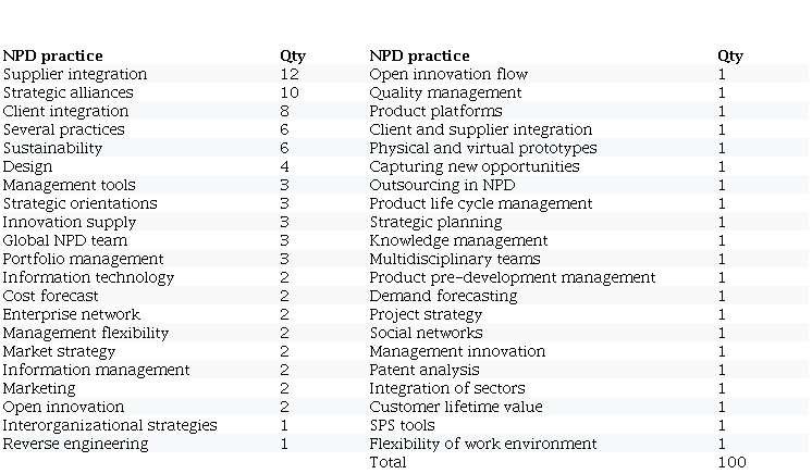 Table 1 presents the result of the analysis, and, considering the multifunctional nature of NPD, it is possible to observe the occurrence of several practices. Among these practices, however, there are a few patterns. The higher incidence found is in the analysis of integration practices at a horizontal level (suppliers and customers), as well as at a vertical level (strategic alliances). Therefore, three categories (i.e. 7% of the total) correspond to 30% of the articles, which indicates that the authors should focus the analysis on them.