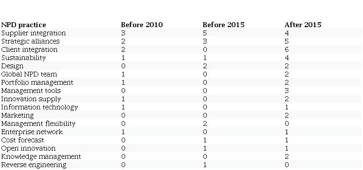 Another relevant finding we identified (Table 2), which provides an overview of the publications over the period analyzed, is that the integration of suppliers and customers, as well as strategic alliances, are topics that have been gaining research interest overtime. There is a trend toward the emergence of some practices that have not yet been studied. Some NPD practices, such as sustainability, marketing and the role of design in the process of developing new products, are seen as emerging research practices in line with the evolution of the business environment and should also be the focus of future studies.