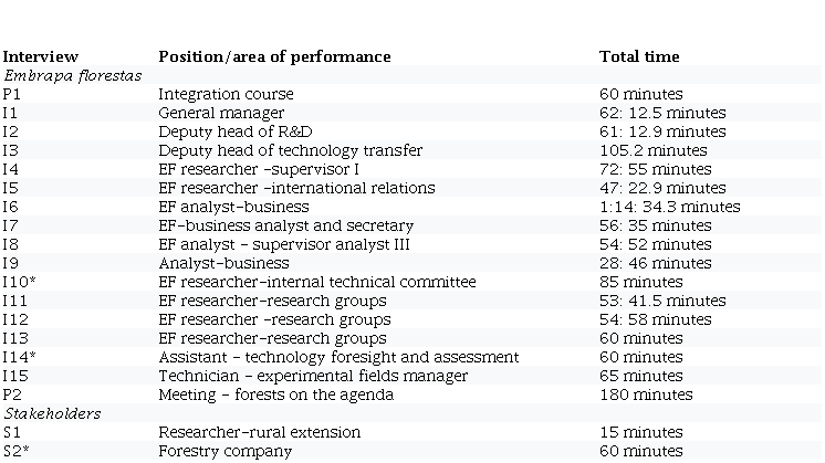 The method adopted was a single case study (Yin, 2010) of Embrapa Florestas' innovation network's opening process and was held in two phases: the first, a qualitative analysis, and the second, a social network analysis (Hanneman & Riddle, 2005). The first part of the data collection consisted of identifying the projects involving the Open Innovation Network of Embrapa Florestas’ Unit (48 projects were already completed and evaluated, 28 projects were completed without evaluation and 30 are still running). Then, 14 researchers and managers from EF and three stakeholders from finished and ongoing projects were interviewed (semi-structured interviews). The interviews with audio recordings were transcribed with Express Scribe Transcriptions v 6.10 software (I9, I13 and S2 did not authorize recording). Transcriptions were later analyzed with Altas.ti software to categorize, organize and record the obtained data (Bandeira-de-Mello, 2006). Detailed field notes on all interviews were prepared, but a greater emphasis was placed on the interviews that could not be recorded and transcribed. Table 1 presents each conducted interview description, each actors' position and the total duration of each interview.