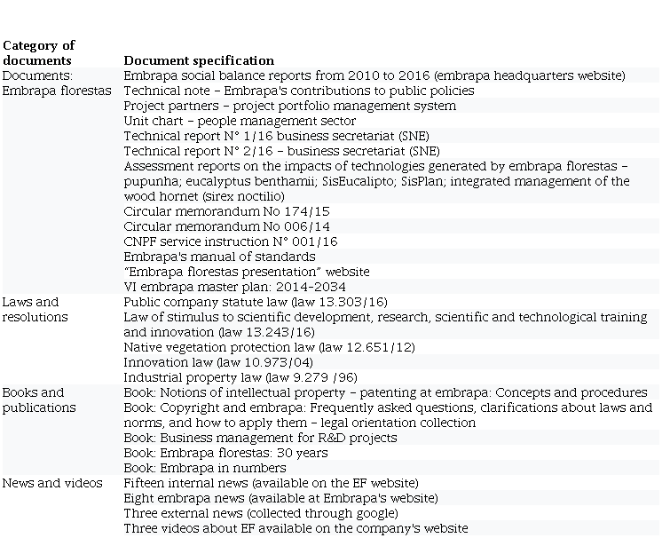 To address this research question, a single case study was conducted in a PRI of the agroforestry area, namely the Brazilian Agricultural Research Corporation (Empresa Brasileira de Pesquisa Agropecuária, abbreviated as the Embrapa) and, more specifically, the Forestry Unit (Embrapa Florestas, abbreviated as the EF). Its purpose is the effective transfer of the results of forestry research for the benefit of society, alongside with technical assistance and rural extension agencies, as well as cooperatives with common agendas, research institutes, national and international universities, and companies with different sizes (Crespi et al., 2019). Through a combination of physical infrastructure, human capital and partners, EF has been recognized as one of the best structured forestry research institutions in Latin America.