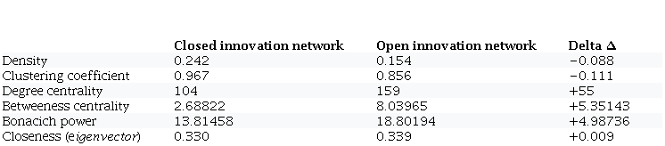 Finally, the research allows for the inference that innovation network openness enables a practical improvement in network structure, both in sociocentric and egocentric terms (Bonfim, Segatto, & Goncalves, 2018; Hanneman & Riddle, 2005). Thus, the network's focal organization can become a network broker or, in the words of Burt (2004), a structural hole that allows the connection between private companies, public research institutes, funding agencies and public and private universities. Focal organization can improve the overall knowledge flow in the network and, consequently, foster innovation (Ahuja, 2000). This organization is relevant because it allows identifying what kind of open innovation network structure is preferable to be adopted after a transition process from a closed innovation network to an open innovation network.