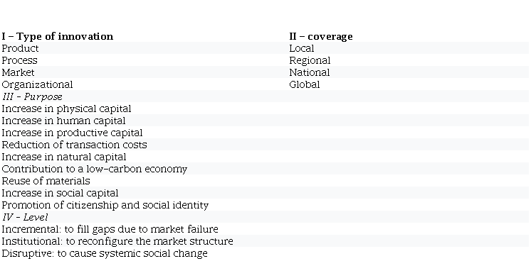 Social innovation has stood out in literature as a research field in formation. D'Amario & Comini (2020), when considering this still incipient research field in literature, developed and validated a scale to understand how social entrepreneurs identify the social innovations created by their ventures. In this study, the authors classified the types (product, process, marketing and organizational) and the intensity of social innovations (disruptive, institutional and incremental).