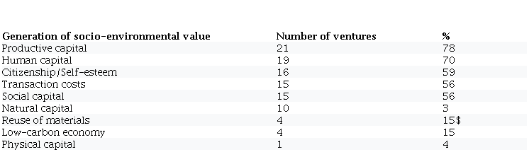 The first stage of the analysis was to identify if there is a relationship between the different types of social ventures and their innovations. The second stage, i.e. the analytical aspect of the social venture, was to analyze the desired generation of socio-environmental value from the nine categories presented in the literature review: Increase in physical capital, increase in human capital, increase in productive capital, increase in social capital, reduction of transaction costs, promotion of citizenship, increase in natural capital, contribution to a low-carbon economy, and reuse of materials. As a social venture may generate socio-environmental value in more than one category intentionally (directly) or collaterally (indirectly), we found necessary to classify each contribution according to their nature:
