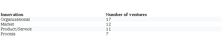 As observed in Figure 5, there is a tendency for social businesses to introduce one-off innovations: 14 ventures developed only one type of innovation.