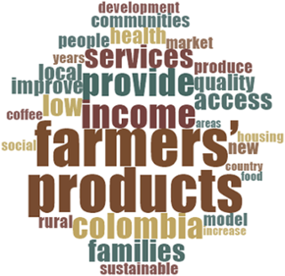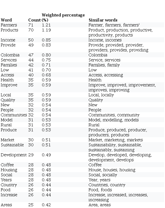 As shown in the word cloud in Figure 1, the most commonly used word is farmers, with a frequency of 71; products and income complete the top three. With lower occurrence, the word cloud also highlights other words directly linked with the agricultural sector, such as food, coffee and rural.