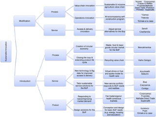 This paper has identified and studied 22 IB examples in the context of BoP markets in Latin America, tracing their sustainability innovations. We have selected the summative content analysis as the methodological approach due to the exploratory nature of the research. Consistent with previous literature, we have found a higher IB proportion in the agriculture, food and beverage sectors. We have identified that SI occurs by either modifying an existing service/process to make it more sustainable or introducing a new product/service/process that can be sustainable. We have found that most SI modified specific processes within companies to implement their IB. The most frequent process modification was at the value chain level, making adaptations to improve the supply chain sustainability. SI introduction occurs in three ways: