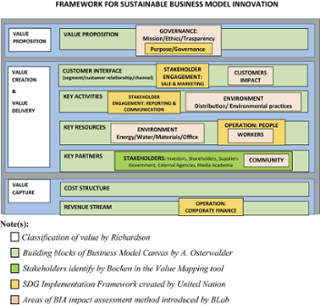 To structure the new framework, we must combine elements and characteristics of various tools of both academic and practical matrices. Regarding academic studies, we must consider the three concepts of value proposed by Richardson (2008), the ten types of stakeholders identified by Bocken, Short, Rana and Evans (2013) in the value mapping tool and the nine building blocks of business model canvas (BMC) proposed by Osterwalder and Pigneur (2010). Then, we must analyze nonacademic sources. We must consider the four areas of BIA (B Impact Assessment) methods promoted by Blab and the elements of the SDG implementation framework created by the United Nations.