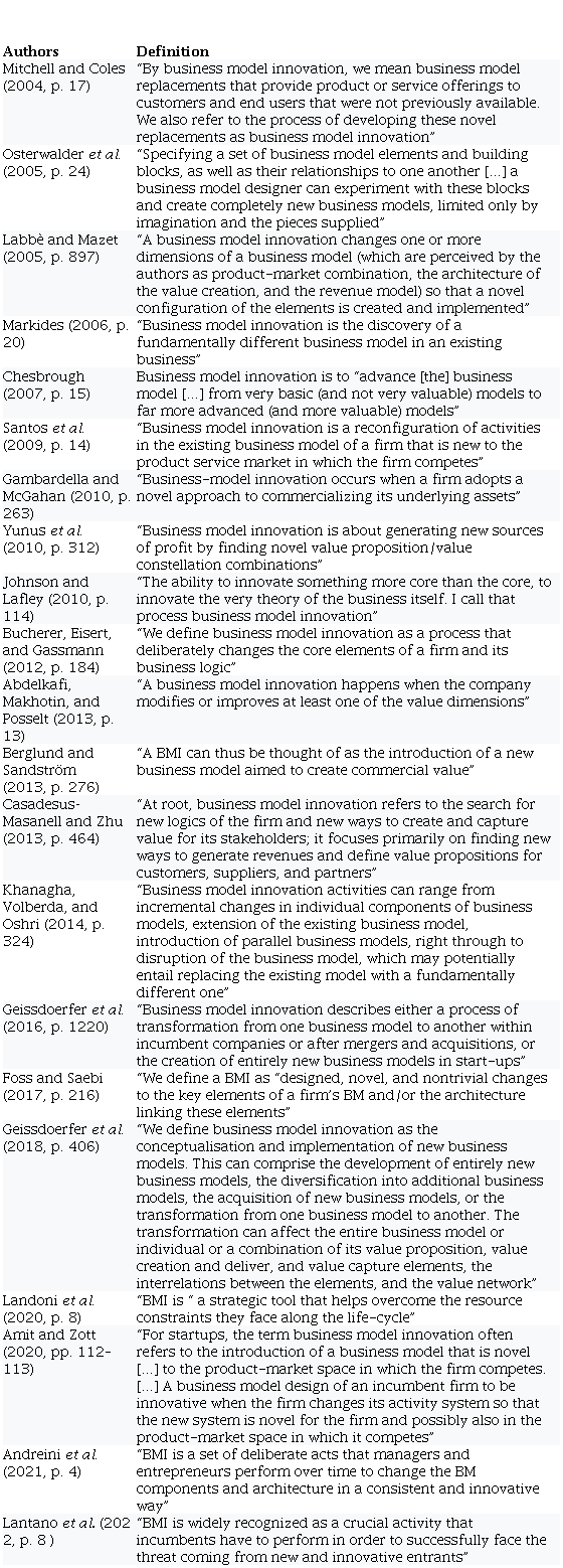 There are several definitionsfor BMI (Table 1). According to Osterwalder et al. (2005), Labbè and Mazet (2005), Santos, Spector and Van der Heyden (2009), Amit and Zott (2020) and Yunus, Moingeon and Lehmann-Ortega (2010), BMI is a reconfiguration of the business model’s elements, of the firm’s activities or of the value proposition.