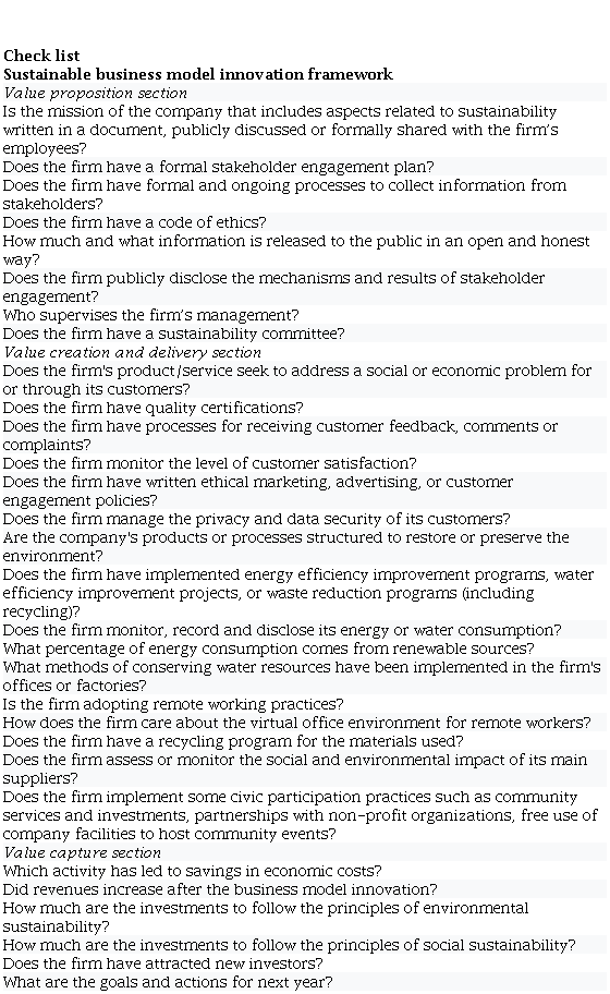 For each of the three dimensions, we have provided some questions the managers should answer at the end of the sustainable business innovation process and which scholars should study in-depth to provide further theoretical insights. In Table 2, we have summarized the questions we would include in a possible checklist.